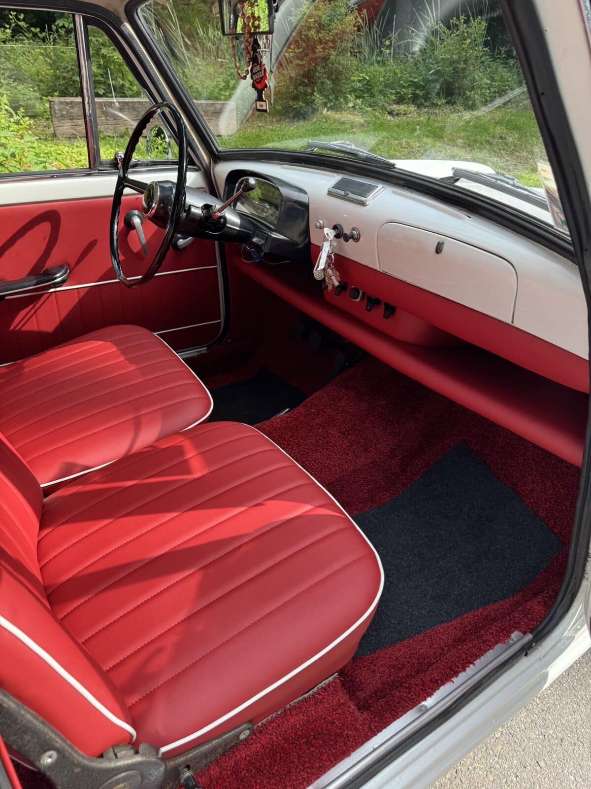 Weiß trifft Weinrot: Die edle Kombi aus weißem Lack und weinrotem Leder macht diesen Fiat 1100 Oldtimer besonders, denn diese Farben passen perfekt zusammen. Außerdem unterstreicht diese stilvolle Farbwahl die zeitlose Eleganz. Deshalb bekommen Sie bei jeder Fahrt bewundernde Blicke.